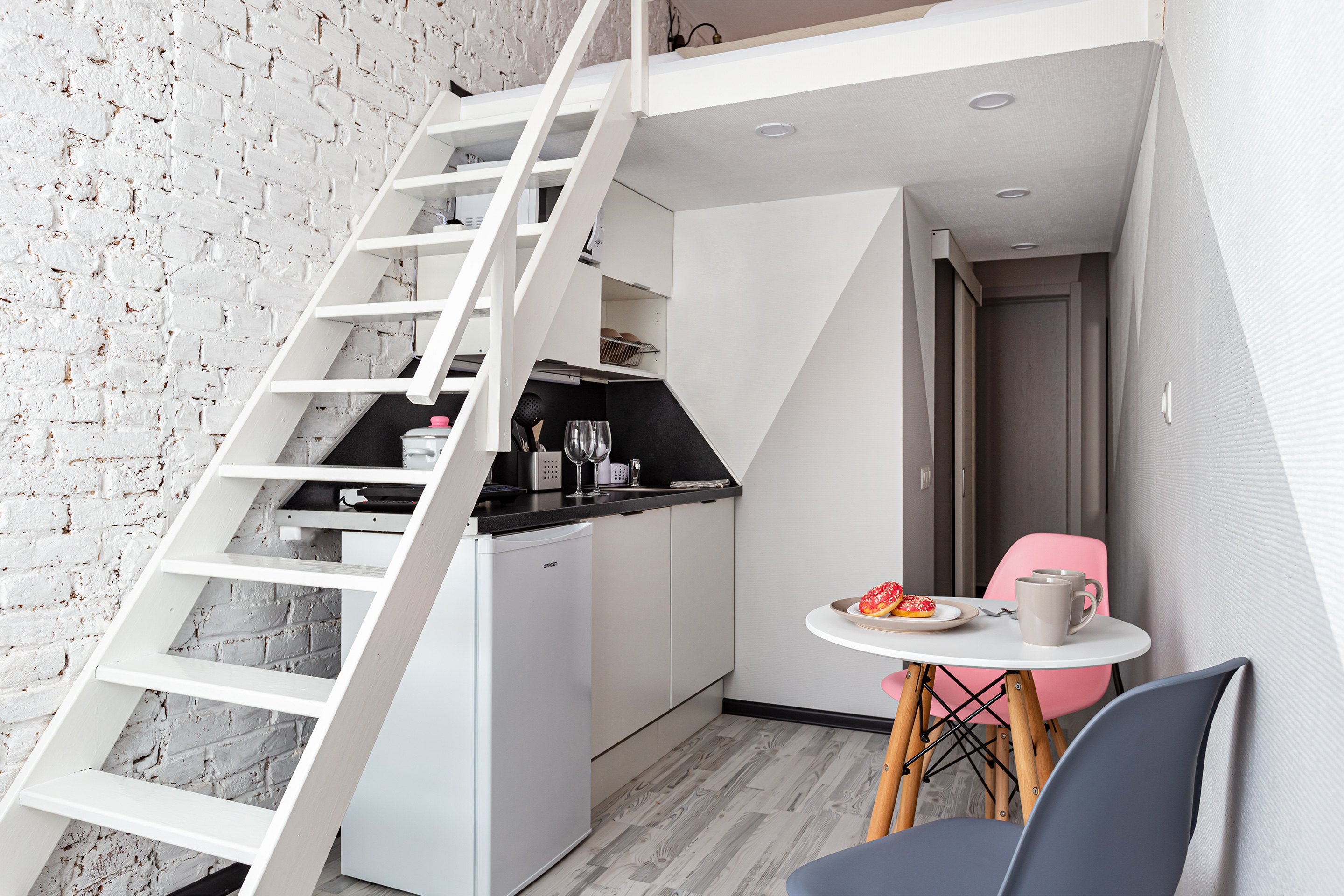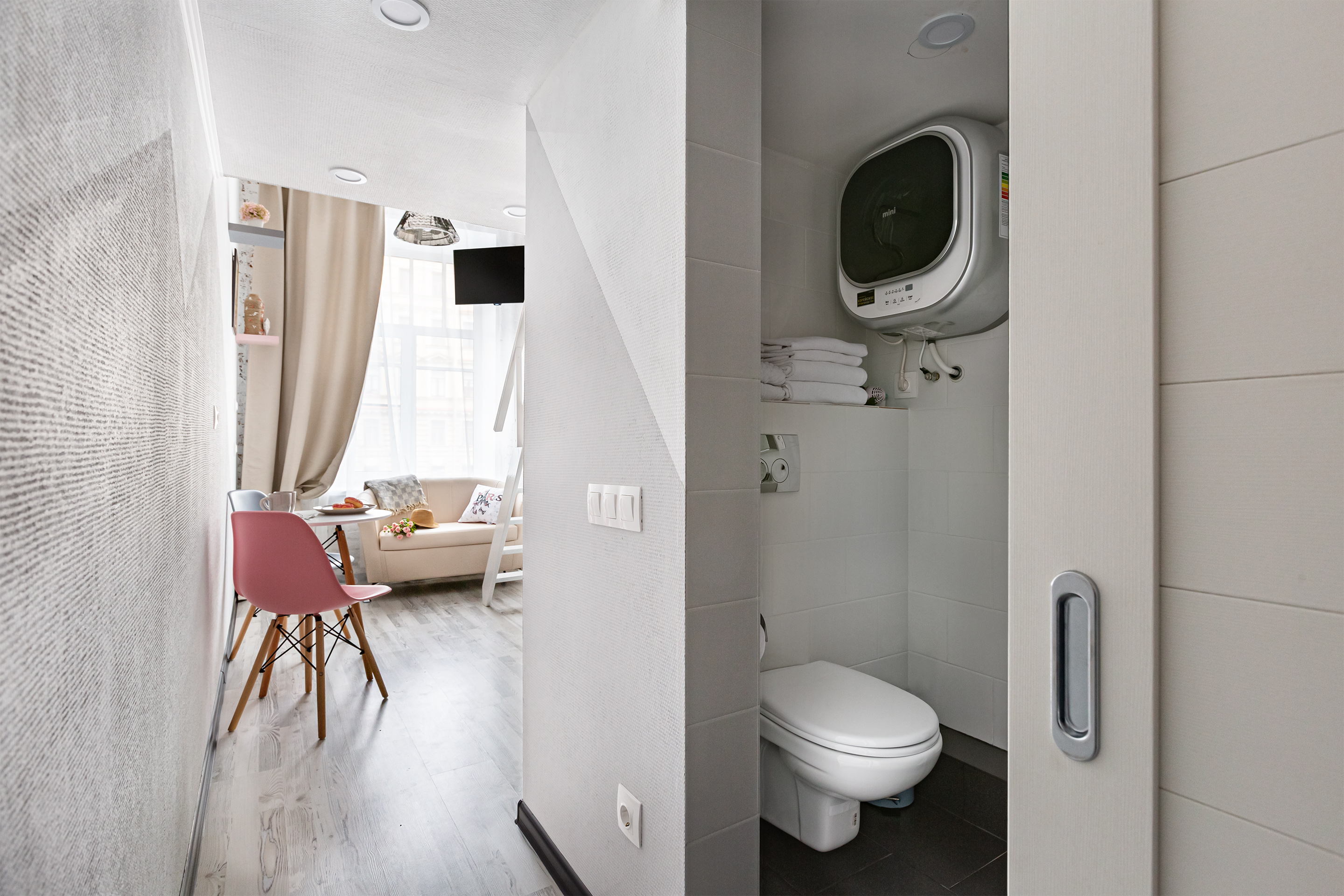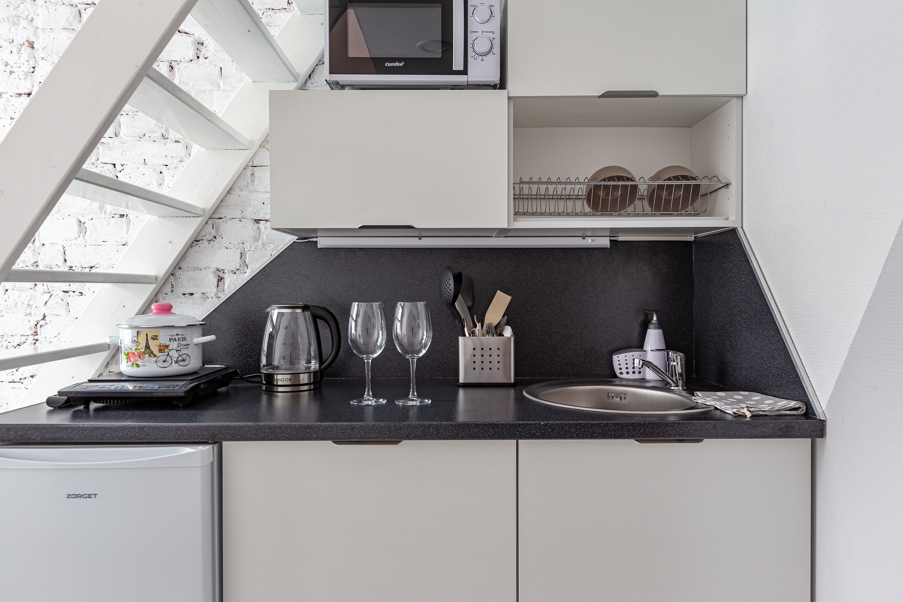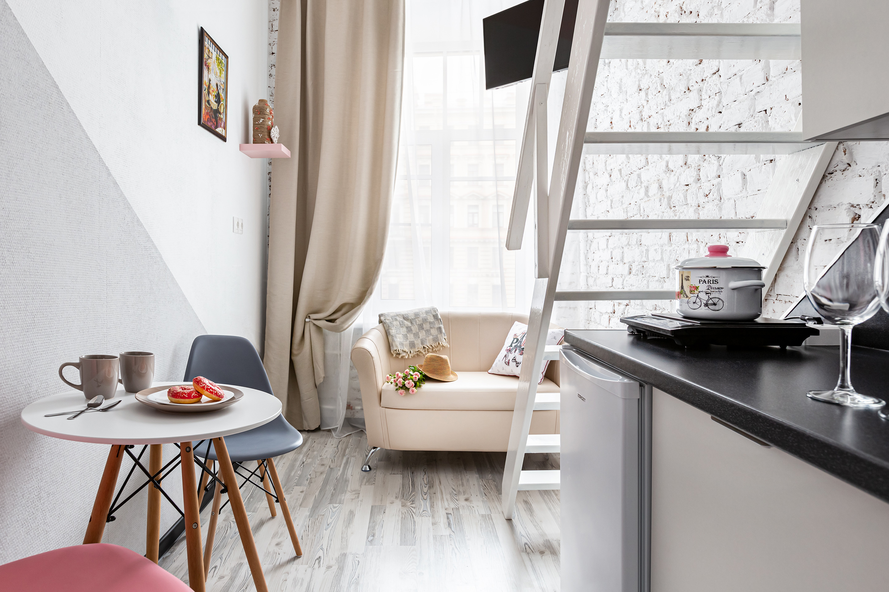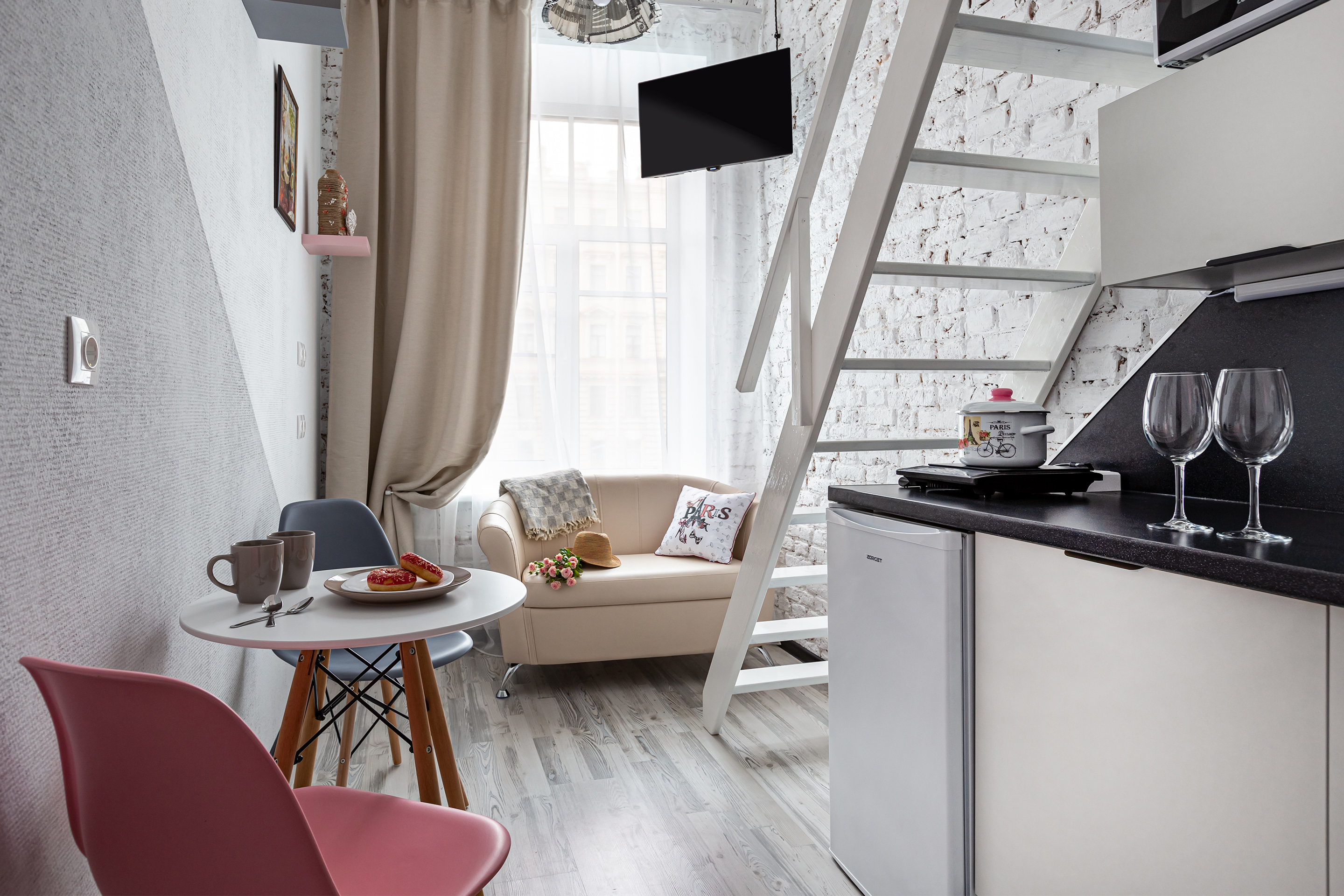 Небольшая студия 14 кв.м. для проживания 1 или 2 человек в самом центре Санкт-Петербурга с прекрасным видом из окна – на канал Грибоедова. Студия оснащена современной мебелью и техникой для полноценного комфортного краткосрочного и длительного проживания. На втором уровне расположена спальная зона с двуспальным ортопедическим матрасом (отсюда вид из окна еще красивее), а внизу оборудована гостиная с мини-кухней, сан. узлом. Кухня оснащена посудой, чайником, электрической плитой, холодильником. Мы предоставляем для Вас свежее постельное белье, полотенца, косметические принадлежности, средства для чистки одежды, губки и сушильные приборы для обуви. Самое главное – студия оснащена электронным замком, что позволяет организовать для Вас бесконтактное заселение. За один день до заезда Вы получите код для замка, которым сможете пользоваться в течение всего проживания. Так же, в целях безопасности, общие зоны оборудованы видеокамерами.